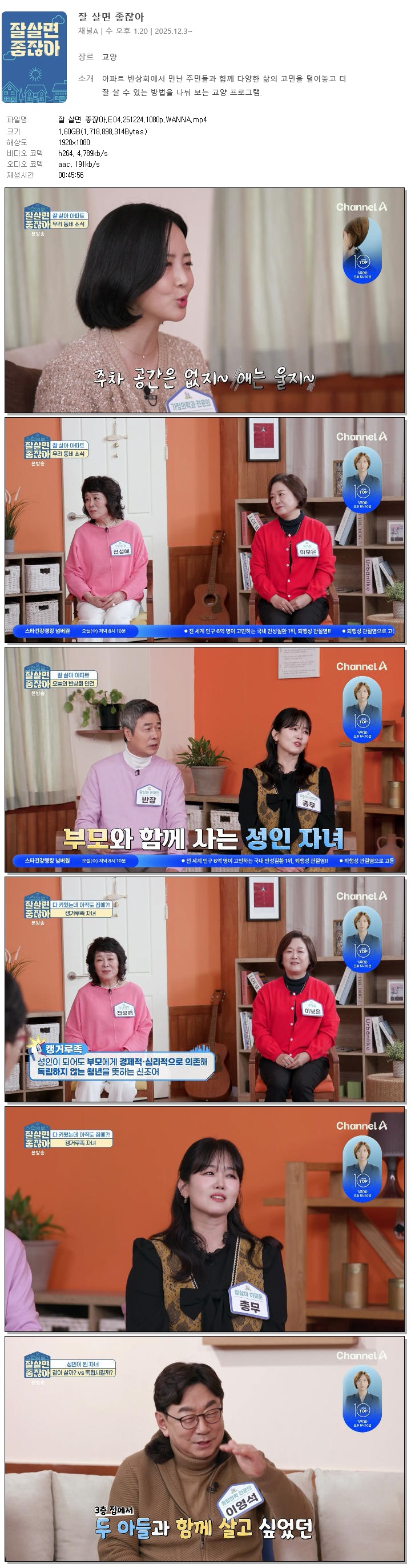[채널A] 잘 살면 좋잖아.E04.251224.1080p.WANNA[선우재덕, 정미애].mp4 1.6 G 00:45:56 1920x1080