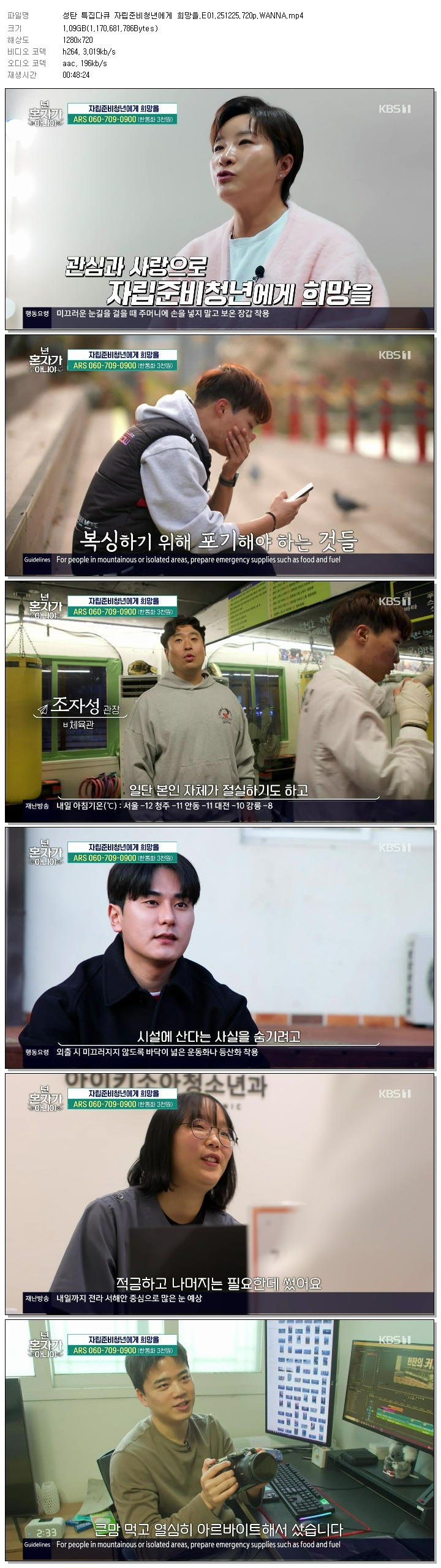 | [KBS1] 성탄 특집다큐 자립준비청년에게 희망을.E01.251225.720p.WANNA.mp4 | 1.1 G | 00:48:24 | 1280x720 |