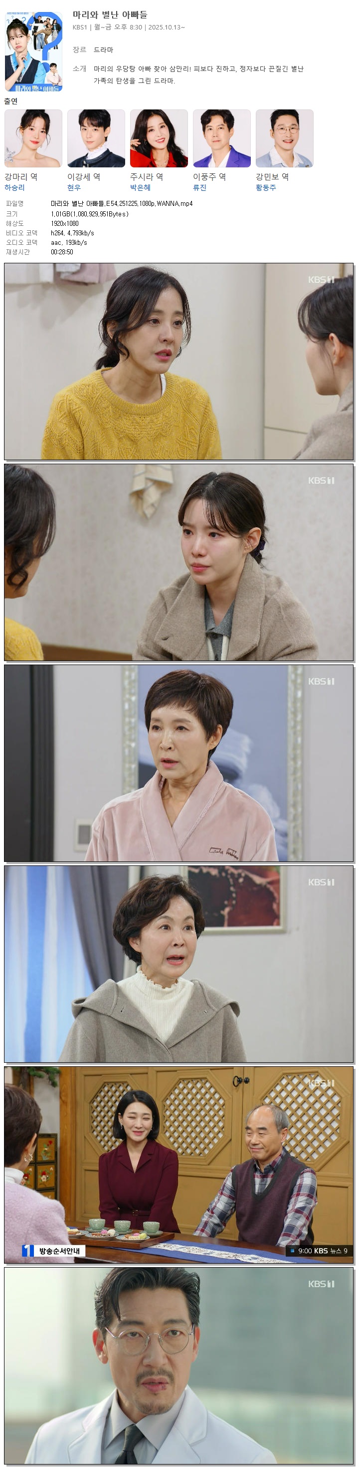 | [KBS1] 마리와 별난 아빠들.E54.251225.1080p.WANNA[하승리, 현우].mp4 | 1 G | 00:28:50 | 1920x1080 |