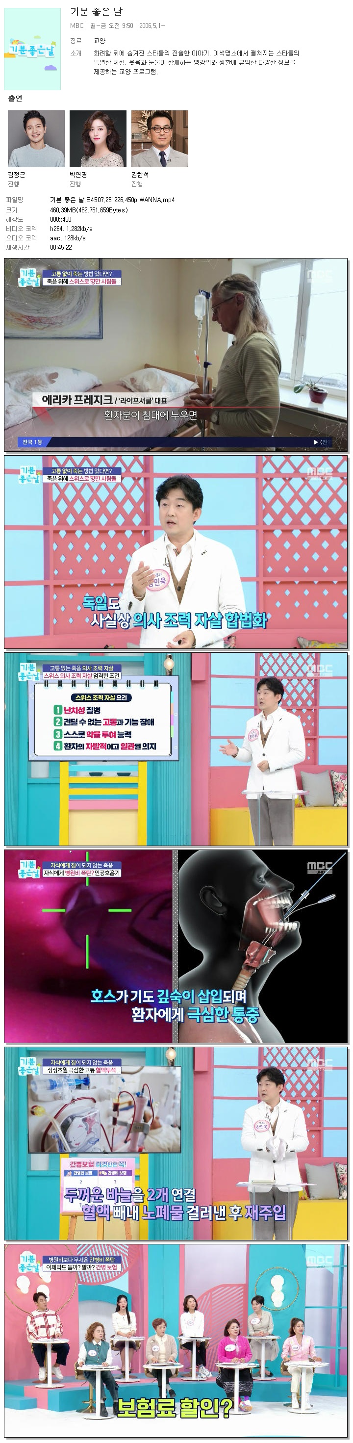 나는 어떻게 나이 들 것인가? ■ 삶의 끝의 마지막 순간을 환자 스스로 선택할 수 있다?! 끝없는 고통 속에서 연명이 아닌 존엄한 죽음을 선택할 권리에 대한 모든 것! 기분 좋은 날 본방 사수하세요 ■ 인공호흡기 시작은 선택, 제거는 불가능?! 신경과 전문의 장민욱과 함께 퀴즈로 알아보는 연명치료를 위한 인공호흡기 선택의 순간! 기분 좋은 날 본방 사수하세요 ■ 간병비 부담 커지면서 간병 보험에 관한 관심도 높아지고 있다?! 간병인 보험 VS 간병비 보험 가족의 간병을 위해 더 효율적인 보험 선택은? 기분 좋은 날에서 함께 하세요 ■ 불편함을 주는 어른 일명 ‘꼰대‘ 내 자신을 돌아보는 꼰대 자가 테스트! 스튜디오를 웃음바다로 만든 오늘의 꼰대왕은 과연 누구? 기분 좋은 날에서 알려드립니다 ■ 콜라겐이 부족하면 탈모는 물론 혈관 질환 위험까지 이어진다?! 머리부터 발끝까지 지키는 영양제 <초저분자 어린 콜라겐> 초저분자 어린 콜라겐이 전신 건강에 도움 되는 이유와 섭취법까지 기분 좋은 날에서 해결해 드립니다!
