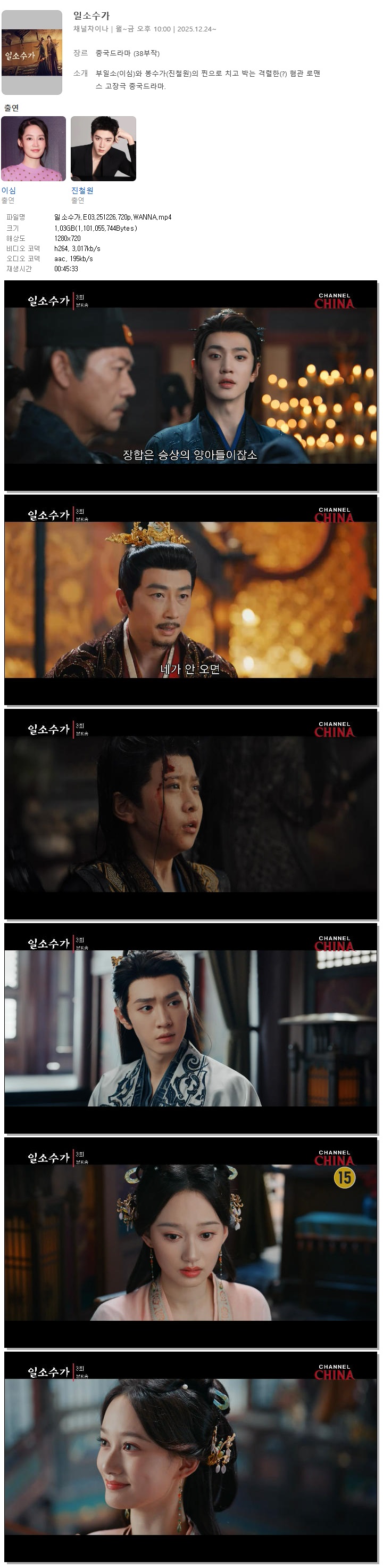 | [채널차이나] 일소수가.E03.251226.720p.WANNA[이심, 진철원].mp4 | 1 G | 00:45:33 | 1280x720 |