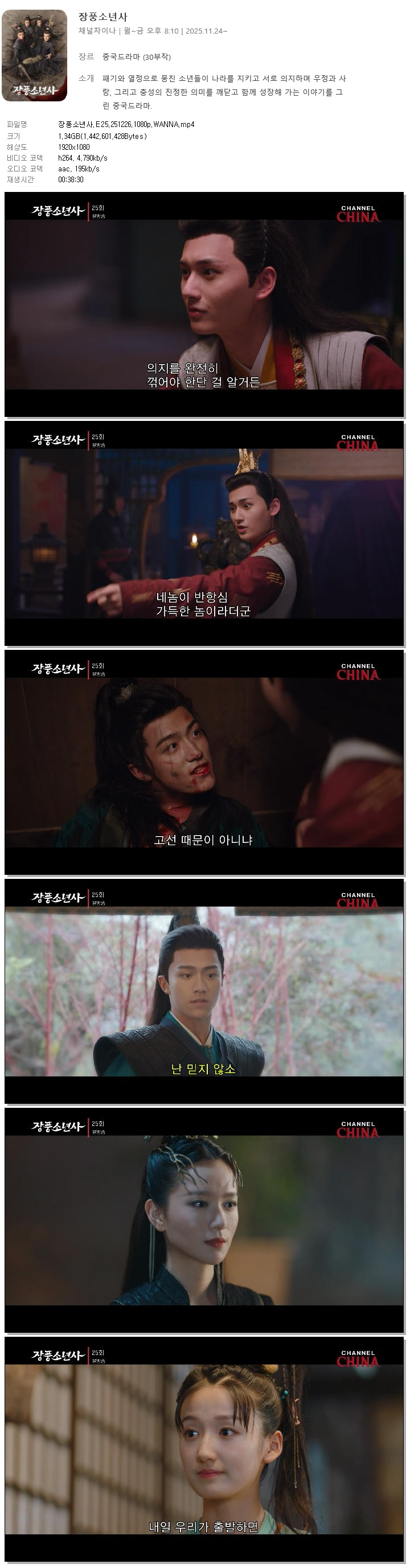 | [채널차이나] 장풍소년사.E25.251226.1080p.WANNA[이탁소, 장강락].mp4 | 1.3 G | 00:38:30 | 1920x1080 |