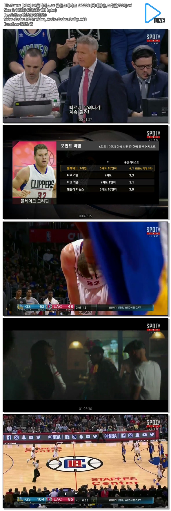 | [NBA] LA클리퍼스 vs 골든스테이트 161208 [국내방송,고화질,720P].avi | 2.4 G | 02:09:46 | 1280x720 |