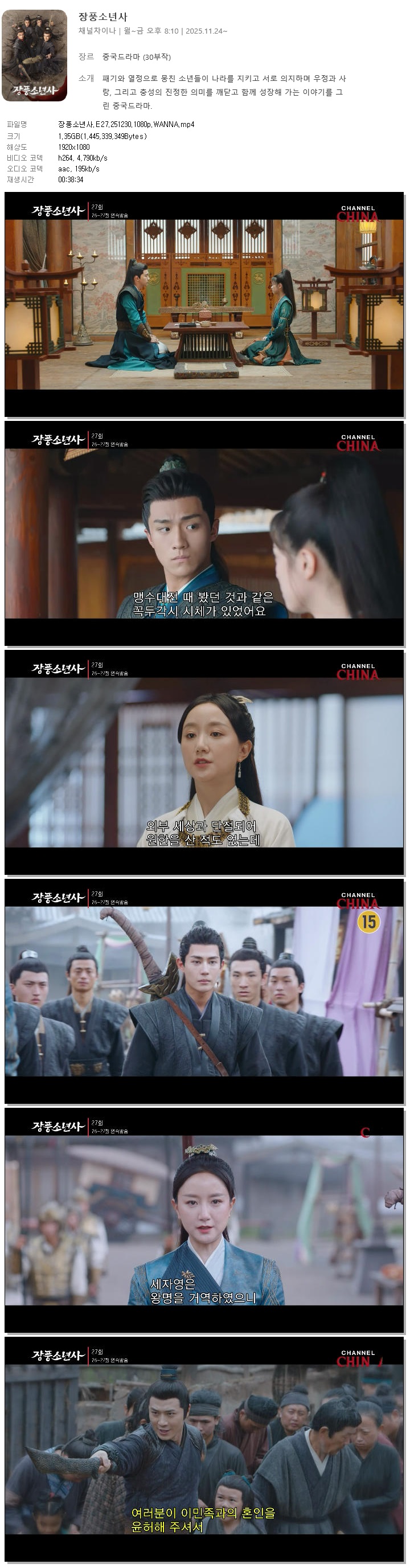| [채널차이나] 장풍소년사.E27.251230.1080p.WANNA[이탁소, 장강락].mp4 | 1.3 G | 00:38:34 | 1920x1080 |