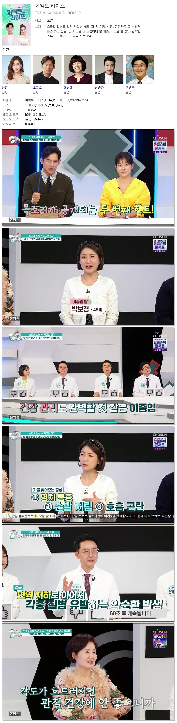 | [TV조선] 퍼펙트 라이프.E267.251231.720p.WANNA[오지호, 현영].mp4 | 1 G | 00:44:39 | 1280x720 |