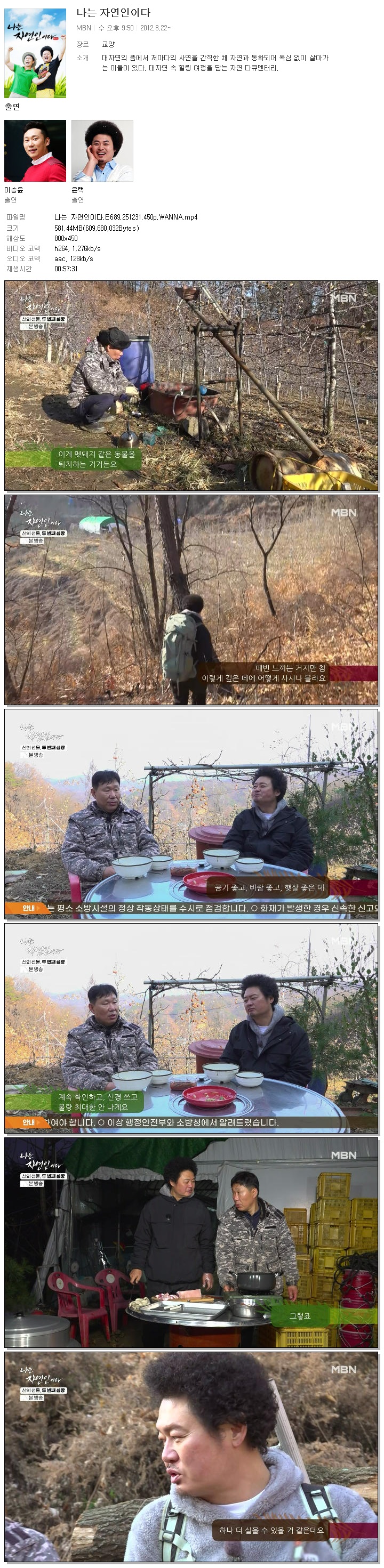 | [MBN] 나는 자연인이다.E689.251231.450p.WANNA[이승윤, 윤택].mp4 | 581.4 M | 00:57:31 | 800x450 |