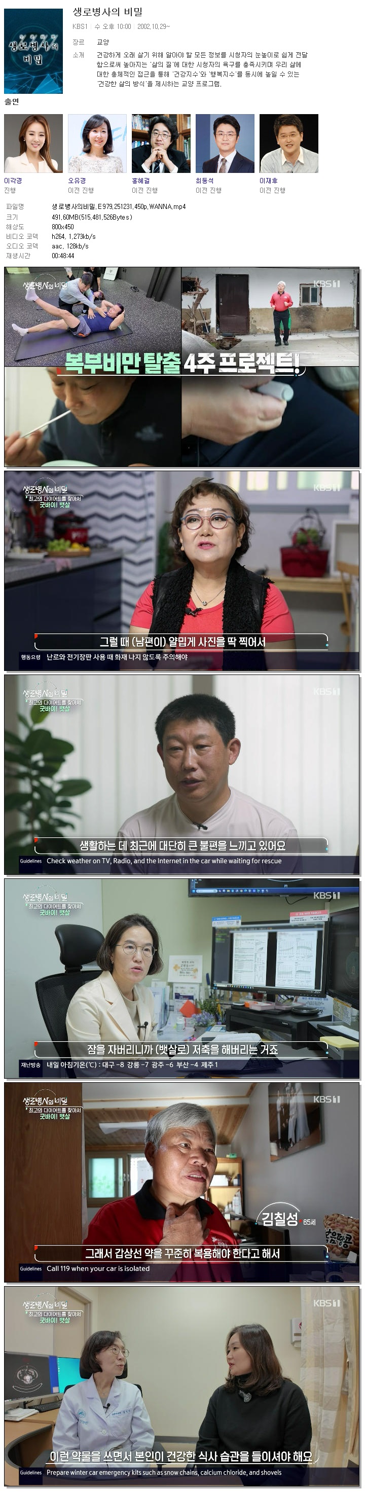 | [KBS1] 생로병사의비밀.E979.251231.450p.WANNA.mp4 | 491.6 M | 00:48:44 | 800x450 |