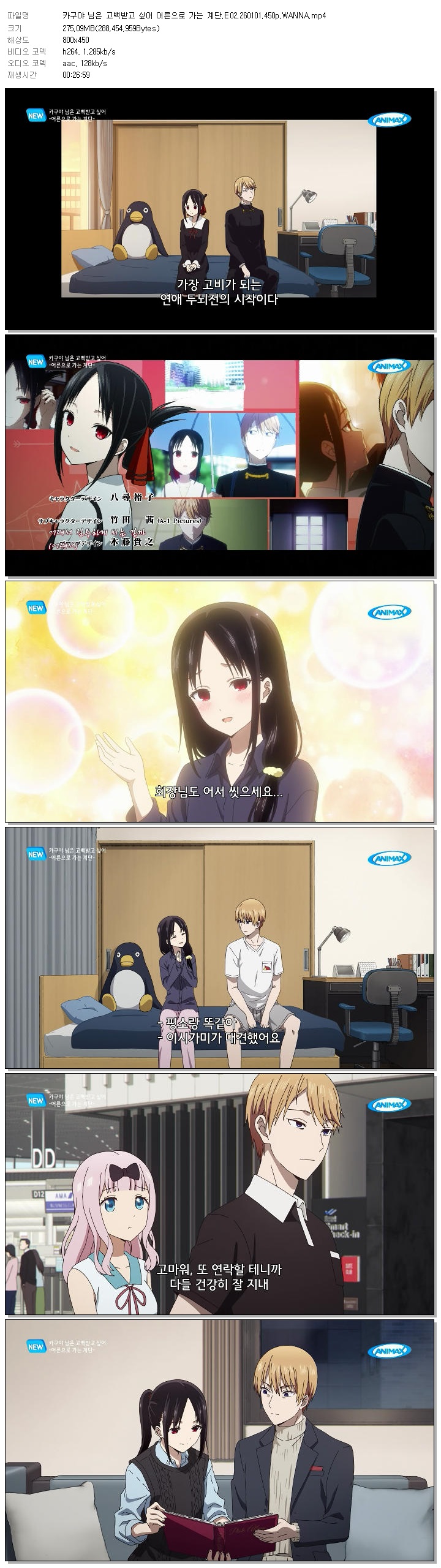 | 카구야 님은 고백받고 싶어 어른으로 가는 계단.E02.260101.450p.WANNA.mp4 | 275.1 M | 00:26:59 | 800x450 |