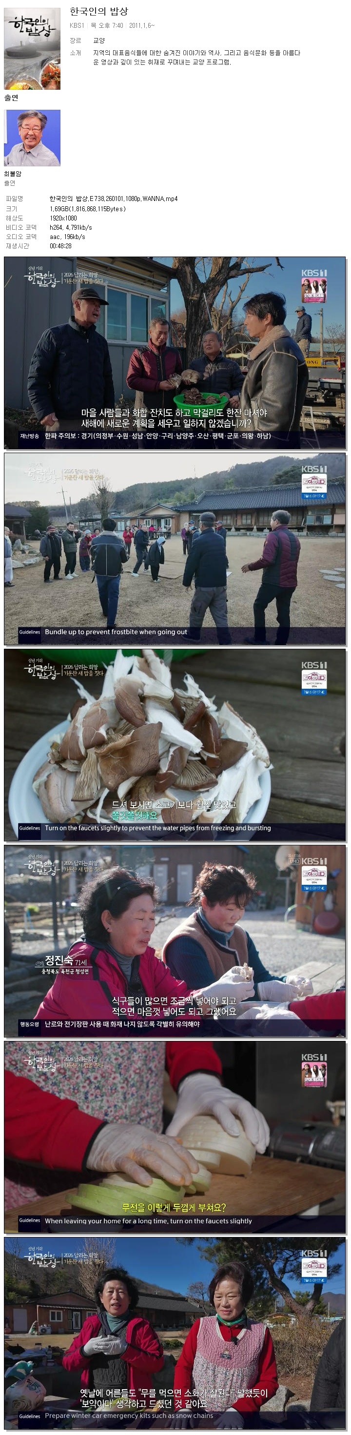 [KBS1] 한국인의 밥상.E738.260101.1080p.WANNA.mp4 1.7 G 00:48:28 1920x1080