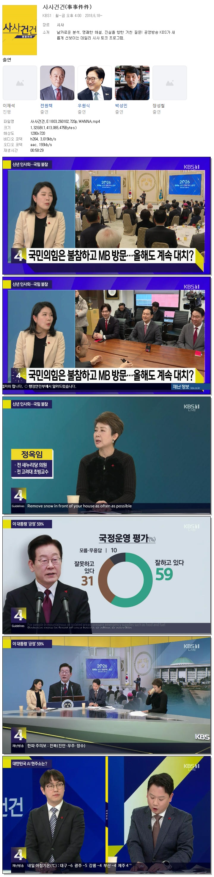 | [KBS1] 사사건건.E1803.260102.720p.WANNA.mp4 | 1.3 G | 00:58:29 | 1280x720 |