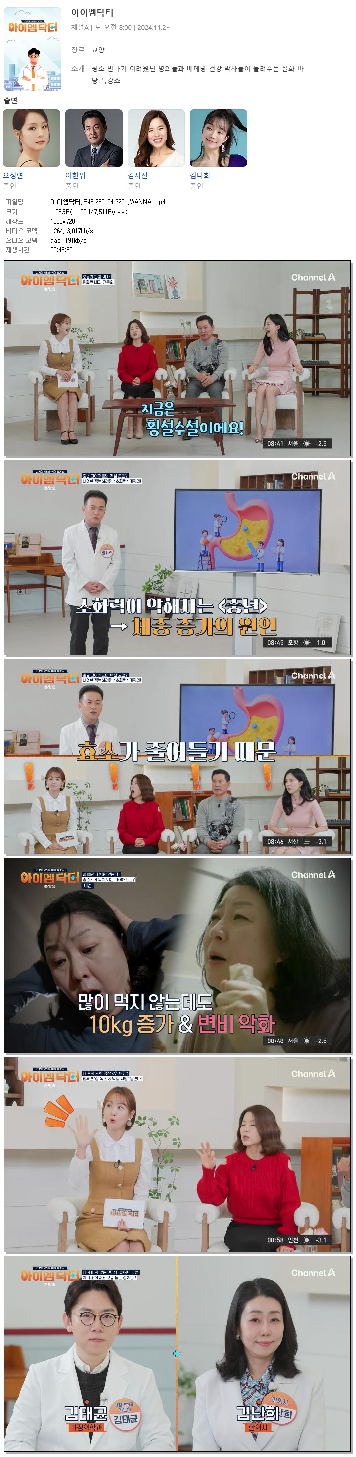 [채널A] 아이엠닥터.E43.260104.720p.WANNA[오정연, 이한위].mp4 1 G 00:45:59 1280x720