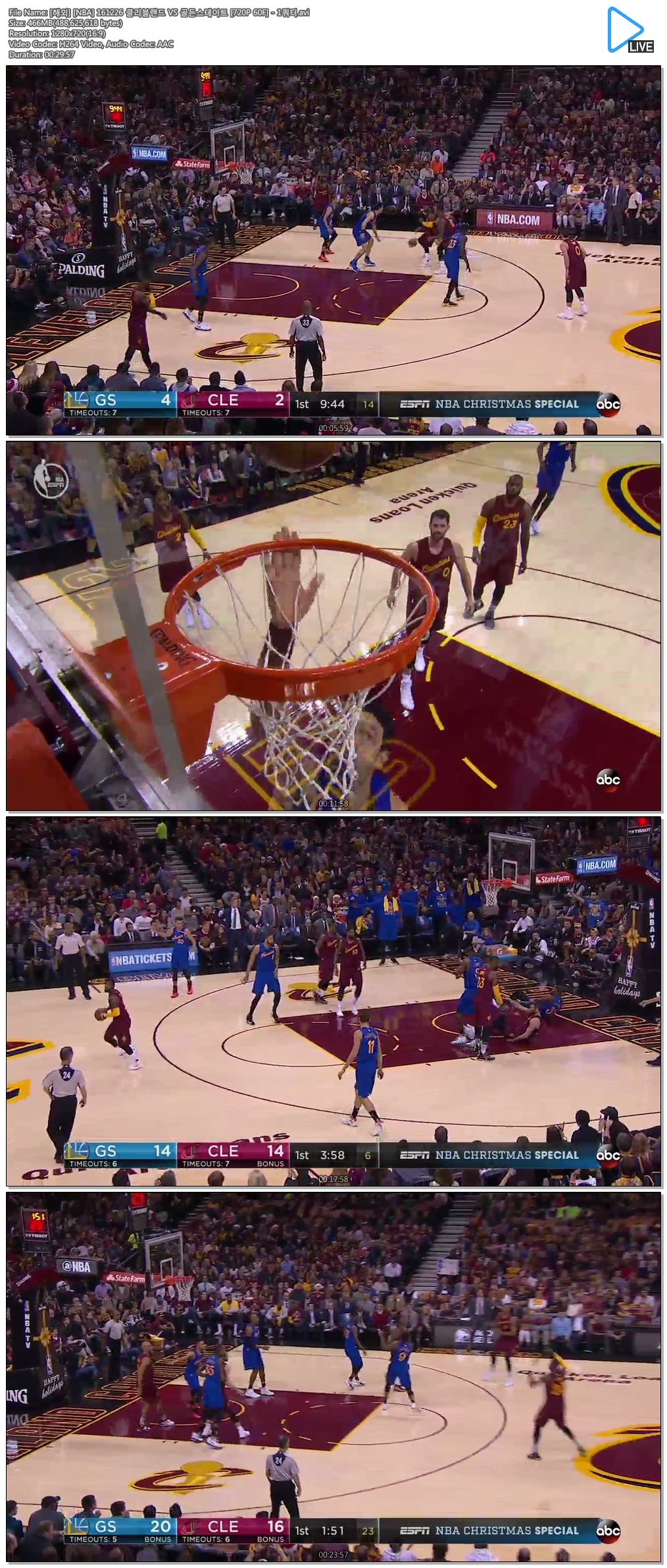 [해외] [NBA] 161226 클리블랜드 VS 골든스테이트 [720P 60F] - 1쿼터.avi 466 M 00:29:57 1280x720