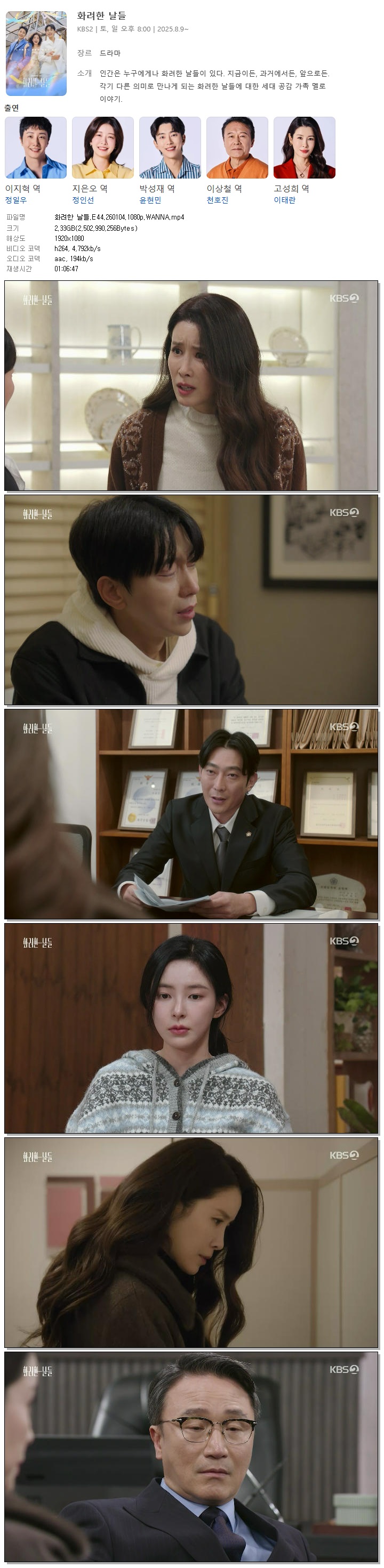 | [KBS2] 화려한 날들.E44.260104.1080p.WANNA[정일우, 정인선].mp4 | 2.3 G | 01:06:47 | 1920x1080 |