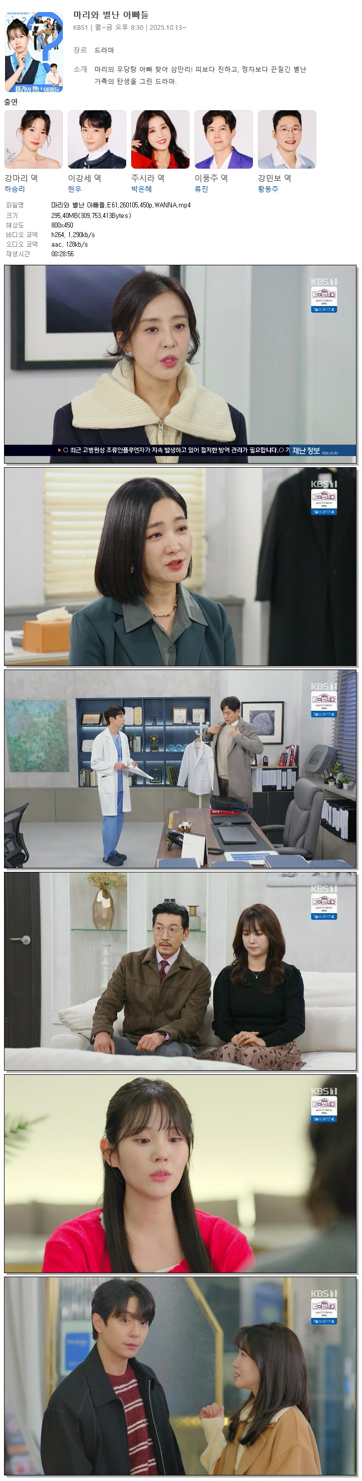 | [KBS1] 마리와 별난 아빠들.E61.260105.450p.WANNA[하승리, 현우].mp4 | 295.4 M | 00:28:56 | 800x450 |