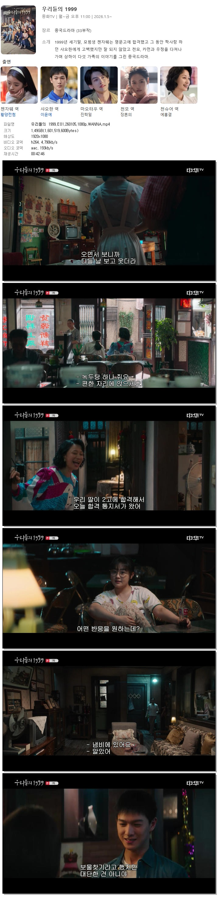 | [중화TV] 우리들의 1999.E01.260105.1080p.WANNA[황양전첨, 이윤예].mp4 | 1.5 G | 00:42:46 | 1920x1080 |