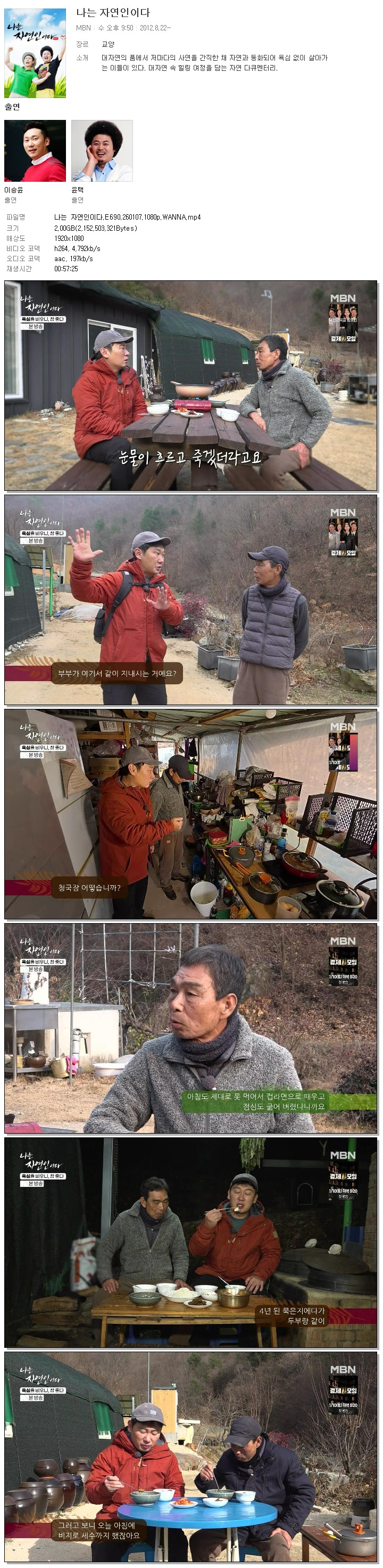 | [MBN] 나는 자연인이다.E690.260107.1080p.WANNA[이승윤, 윤택].mp4 | 2 G | 00:57:25 | 1920x1080 |