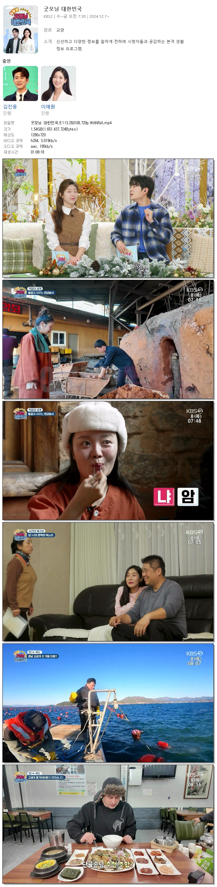 | [KBS2] 굿모닝 대한민국.E113.260108.720p.WANNA[김진웅, 이예원].mp4 | 1.5 G | 01:08:18 | 1280x720 |