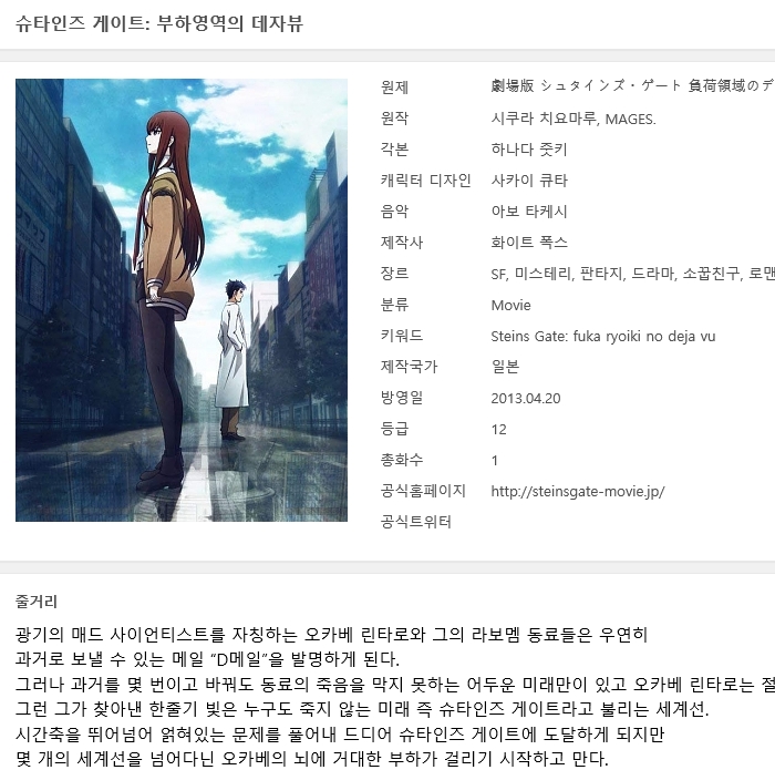 [애니] 슈타인즈 게이트 - 부하영역의 데자뷰 [극장판] -미스테리 드라마- 다시보기 토렌트