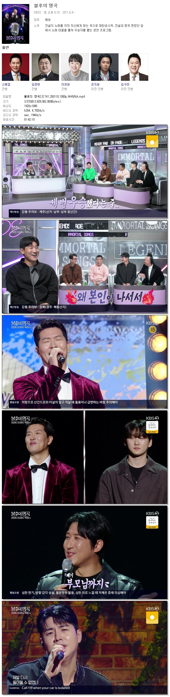 | [KBS2] 불후의 명곡2.E741.260110.1080p.WANNA[유희관, 이대형].mp4 | 3.6 G | 01:42:10 | 1920x1080 |