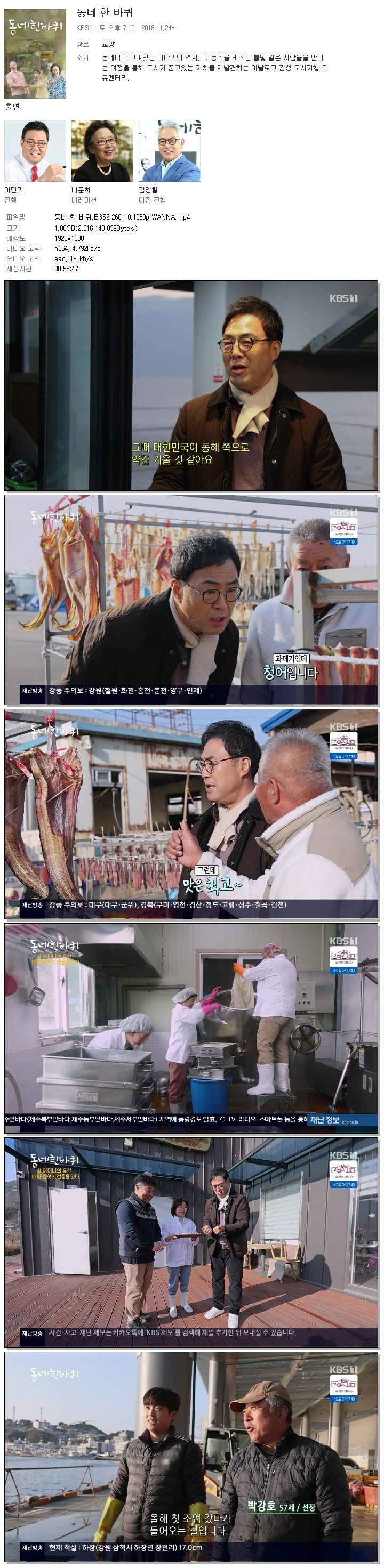 | [KBS1] 동네 한 바퀴.E352.260110.1080p.WANNA[이만기].mp4 | 1.9 G | 00:53:47 | 1920x1080 |