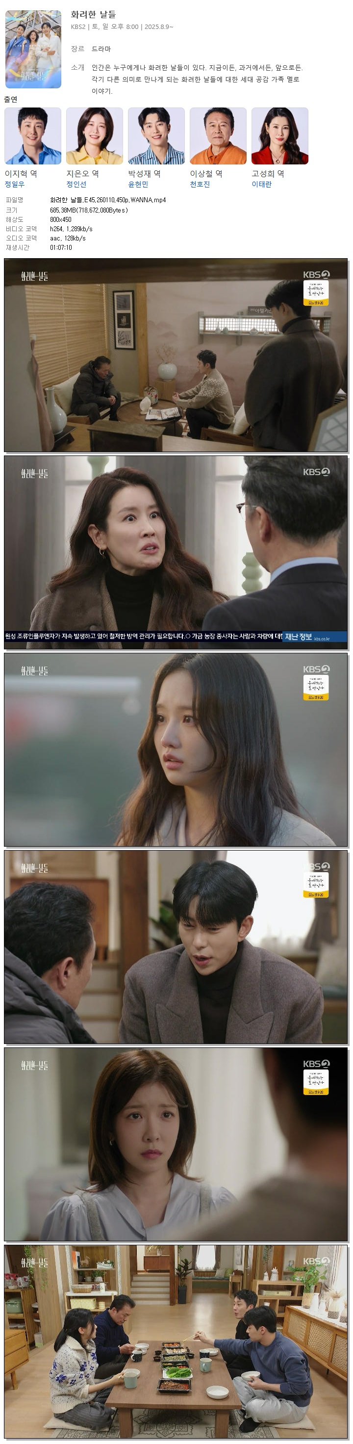 | [KBS2] 화려한 날들.E45.260110.450p.WANNA[정일우, 정인선].mp4 | 685.4 M | 01:07:10 | 800x450 |