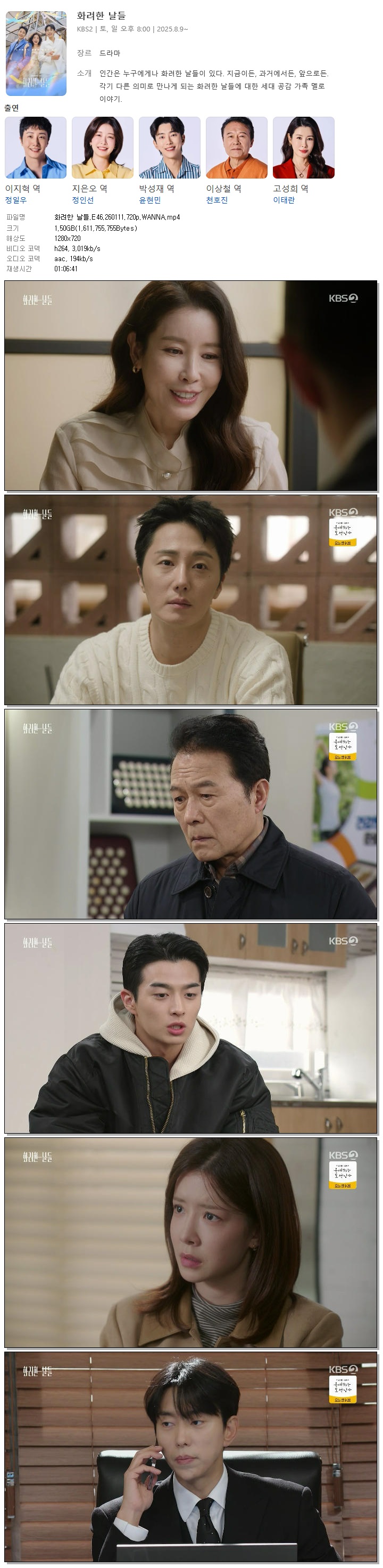 [KBS2] 화려한 날들.E46.260111.720p.WANNA[정일우, 정인선].mp4 1.5 G 01:06:41 1280x720