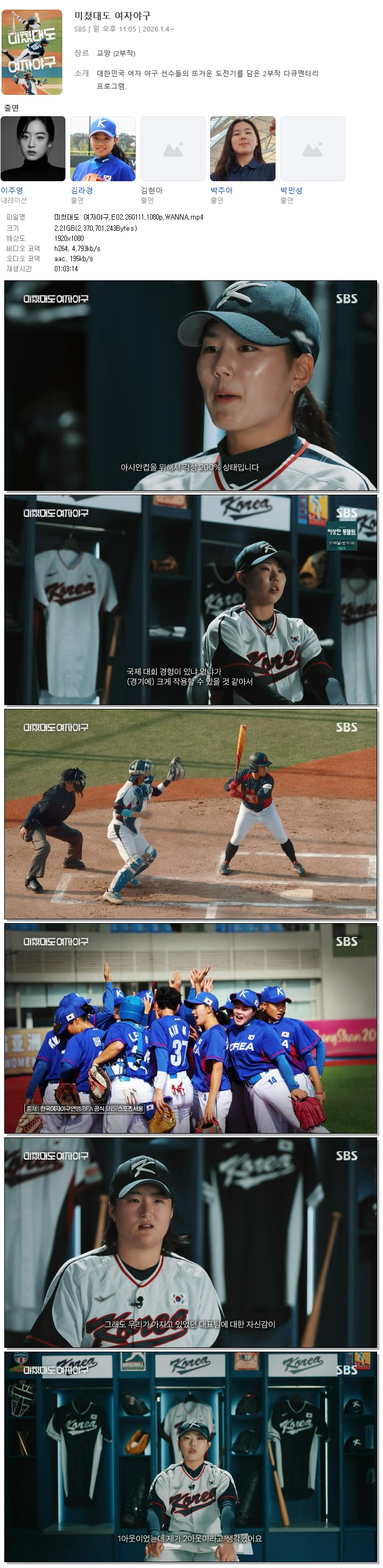 [SBS] 미쳤대도 여자야구.E02.260111.1080p.WANNA[김라경, 박주아].mp4 2.2 G 01:03:14 1920x1080
