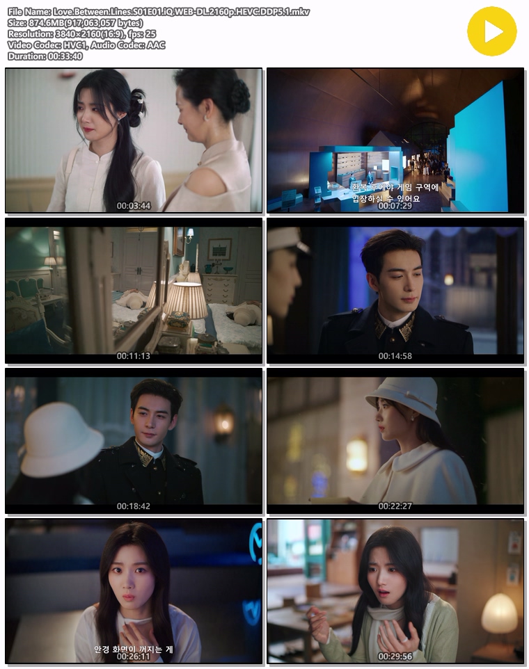 | Love.Between.Lines.S01E01.iQ.WEB-DL.2160p.HEVC.DDP51.mkv | 874.6 M | 00:33:40 | 3840x2160 |