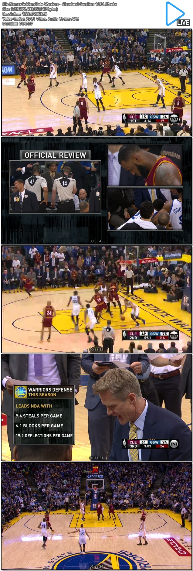 | Golden State Warriors - Cleveland Cavaliers 16.01.17.mkv | 2.2 G | 01:47:17 | 1280x720 |