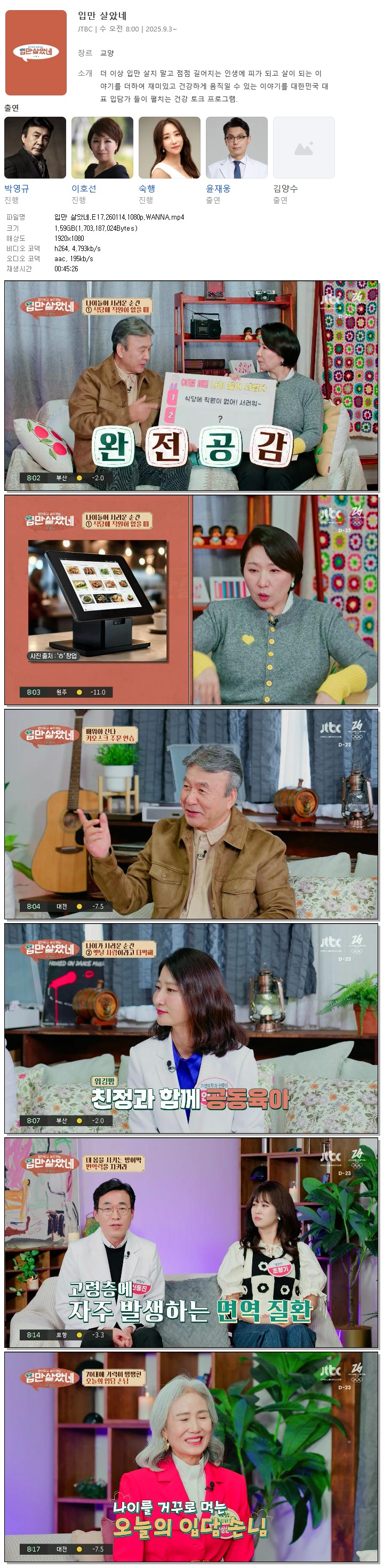 [JTBC] 입만 살았네.E17.260114.1080p.WANNA[박영규, 이호선].mp4 1.6 G 00:45:26 1920x1080