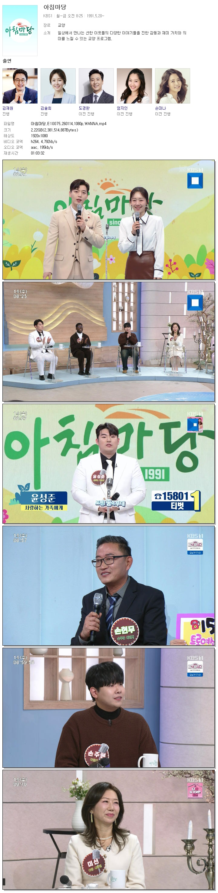 | [KBS1] 아침마당.E10075.260114.1080p.WANNA[김재원, 엄지인].mp4 | 2.2 G | 01:03:32 | 1920x1080 |