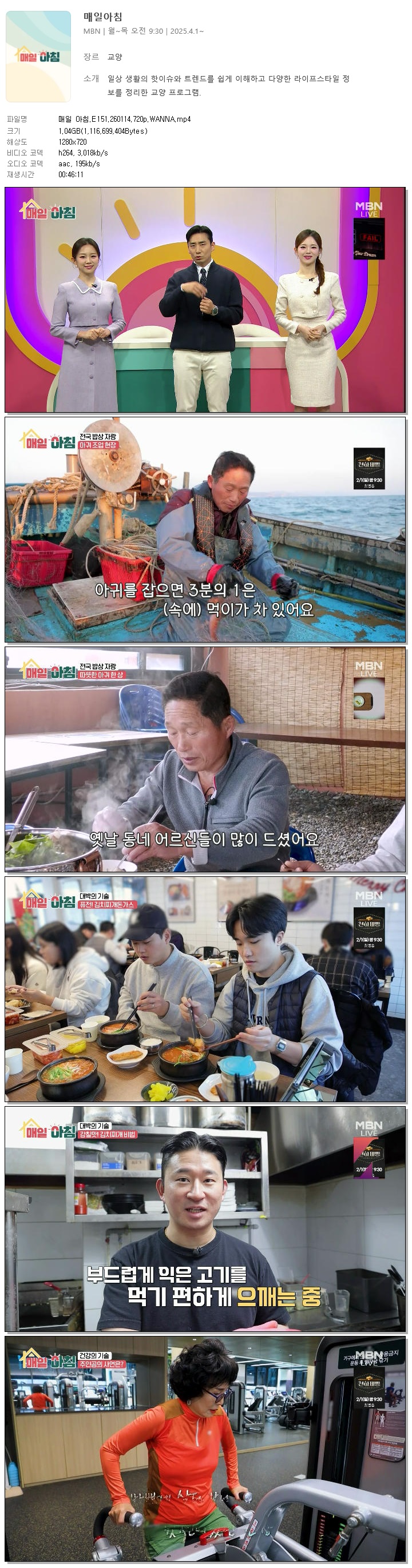 | [MBN] 매일 아침.E151.260114.720p.WANNA[한혜원, 이정수].mp4 | 1 G | 00:46:11 | 1280x720 |