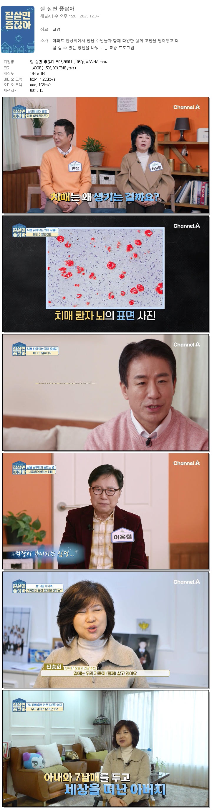 | [채널A] 잘 살면 좋잖아.E06.260111.1080p.WANNA[선우재덕, 정미애].mp4 | 1.4 G | 00:45:13 | 1920x1080 |