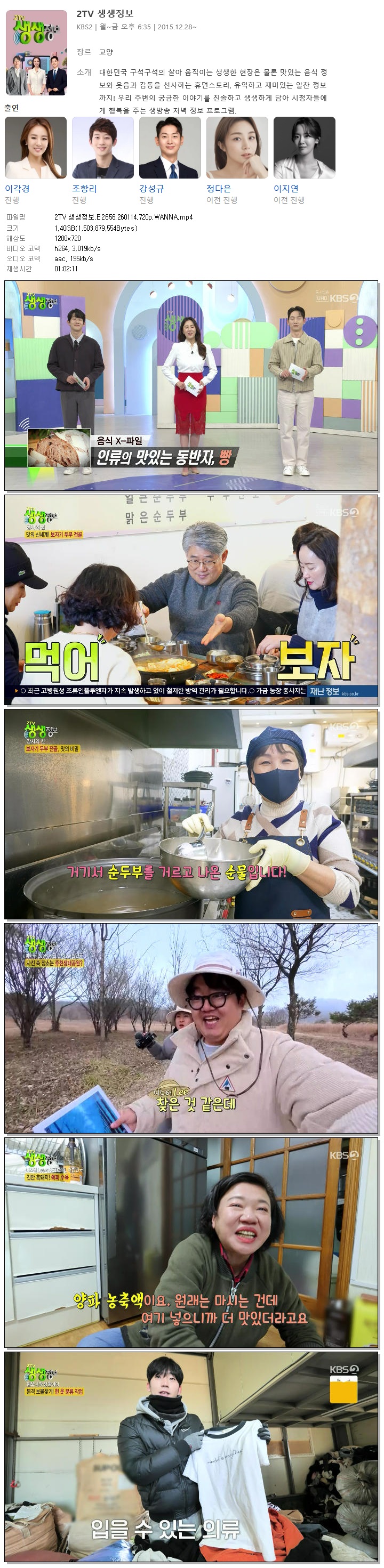[KBS2] 2TV 생생정보.E2656.260114.720p.WANNA[이각경, 조항리].mp4 1.4 G 01:02:11 1280x720