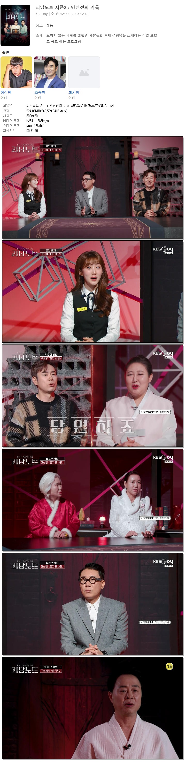 | [KBS JOY] 괴담노트 시즌2 만신전의 기록.E04.260115.450p.WANNA[이상민, 조충현].mp4 | 524.1 M | 00:51:20 | 800x450 |