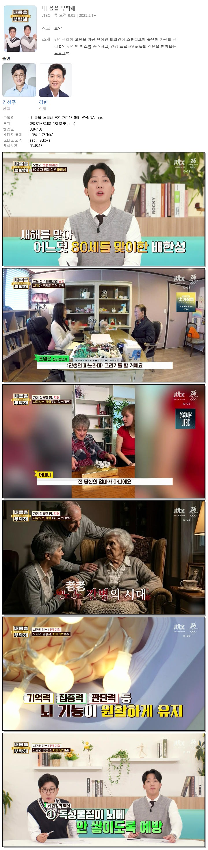 [JTBC] 내 몸을 부탁해.E31.260115.450p.WANNA[김성주, 김환].mp4 458.8 M 00:45:15 800x450