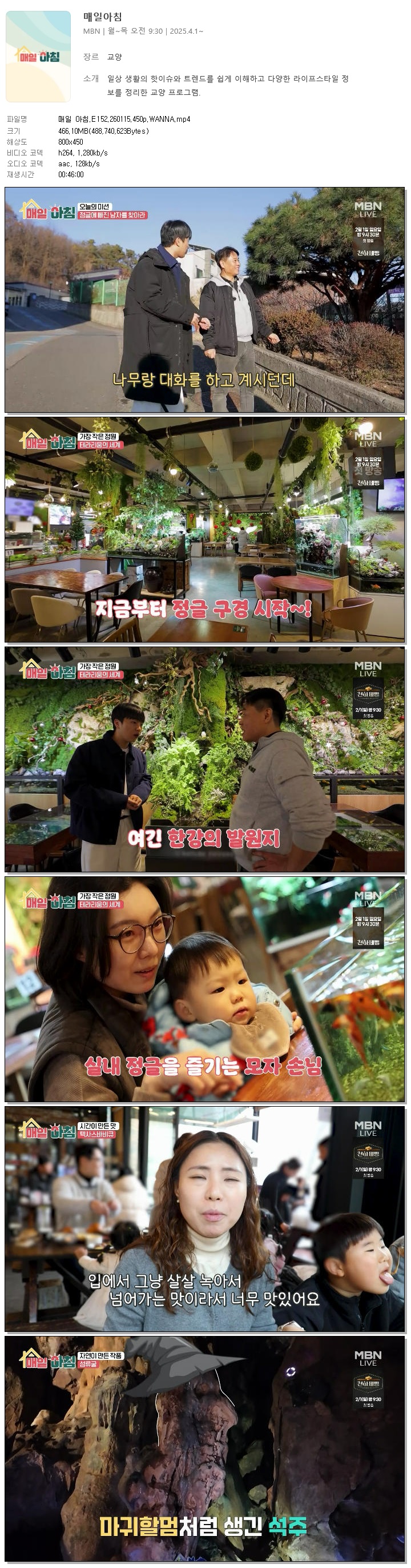 | [MBN] 매일 아침.E152.260115.450p.WANNA[한혜원, 이정수].mp4 | 466.1 M | 00:46:00 | 800x450 |