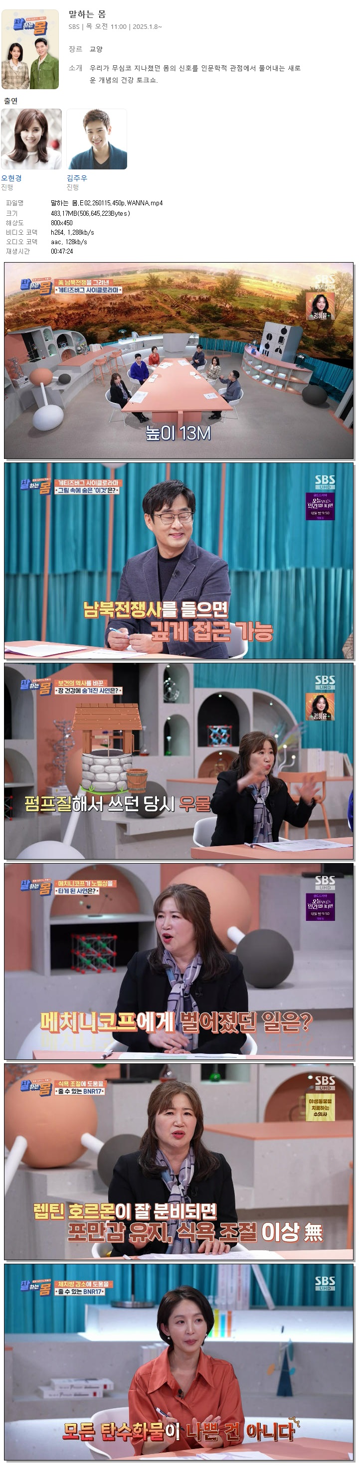 | [SBS] 말하는 몸.E02.260115.450p.WANNA[오현경, 김주우].mp4 | 483.2 M | 00:47:24 | 800x450 |