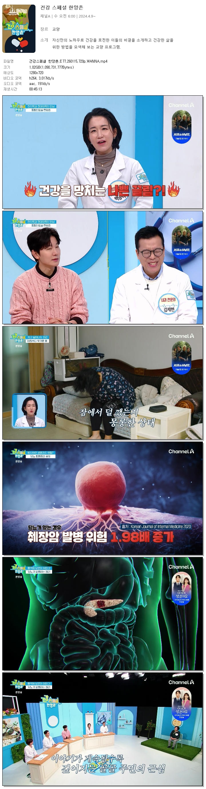 [채널A] 건강스페셜 한양촌.E77.260115.720p.WANNA[김정근].mp4 1 G 00:45:13 1280x720