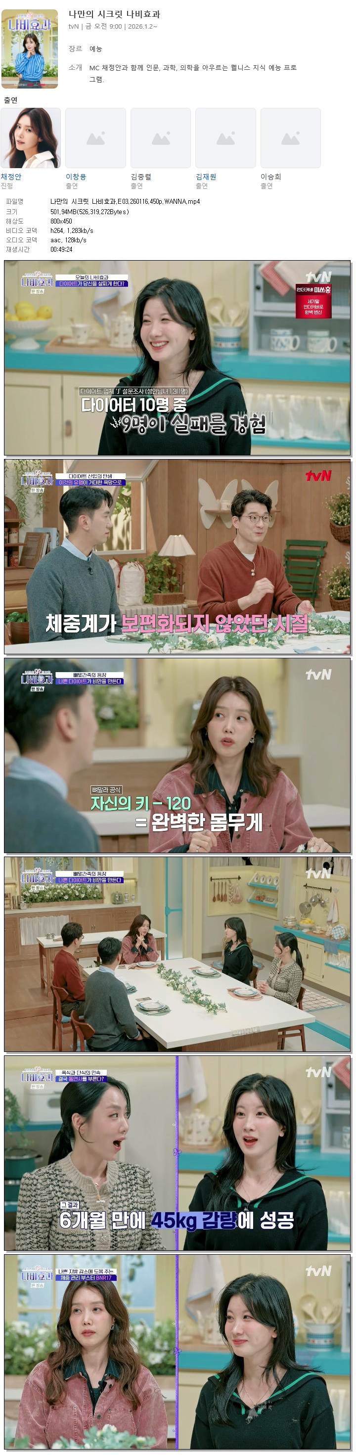 | [TVN] 나만의 시크릿 나비효과.E03.260116.450p.WANNA[채정안, 이창용].mp4 | 501.9 M | 00:49:24 | 800x450 |