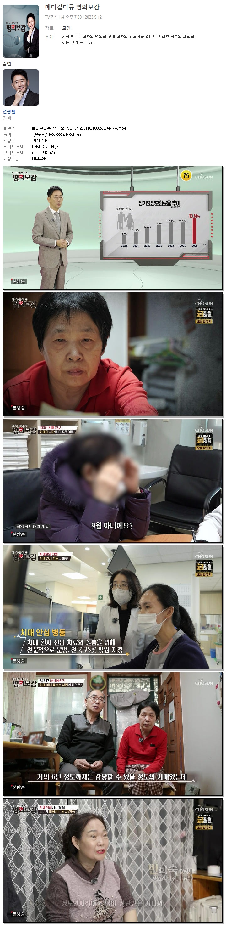 [TV조선] 메디컬다큐 명의보감.E124.260116.1080p.WANNA[전광렬].mp4 1.6 G 00:44:26 1920x1080