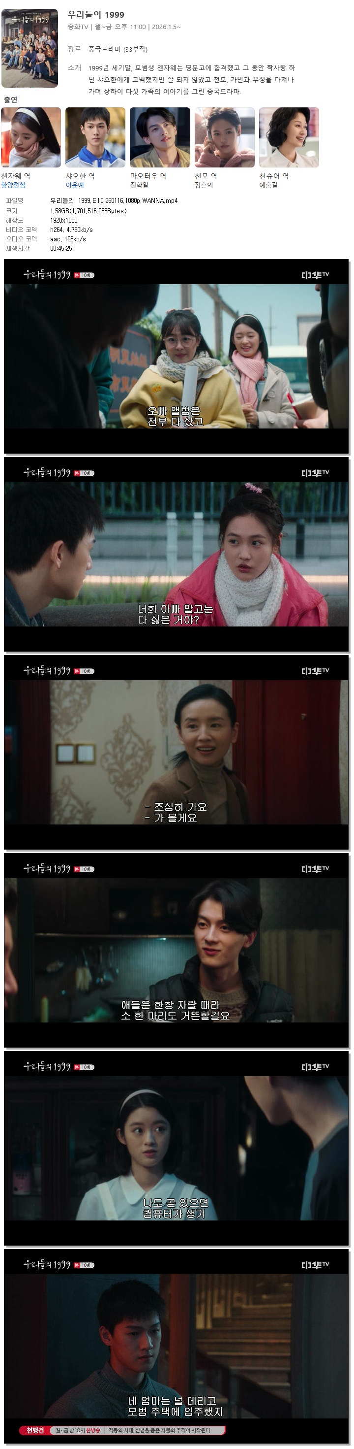 | [중화TV] 우리들의 1999.E10.260116.1080p.WANNA[황양전첨, 이윤예].mp4 | 1.6 G | 00:45:25 | 1920x1080 |
