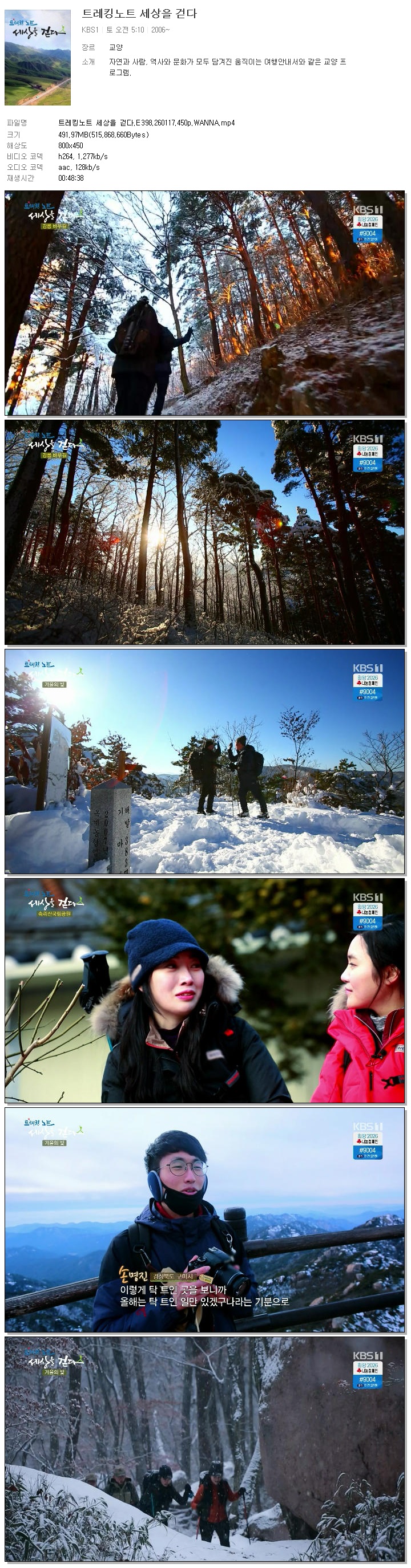 [KBS1] 트레킹노트 세상을 걷다.E398.260117.450p.WANNA.mp4 492 M 00:48:38 800x450