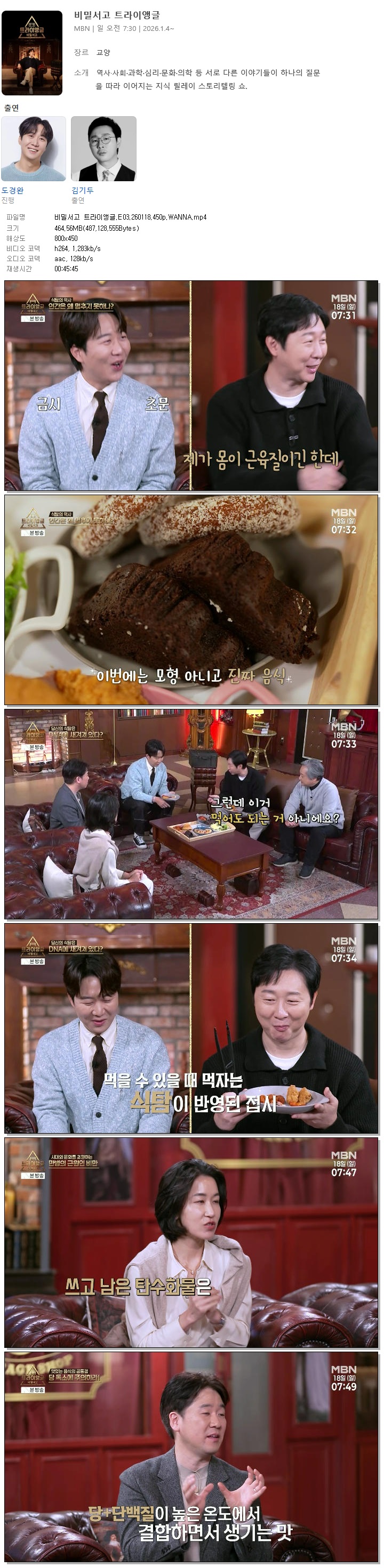 | [MBN] 비밀서고 트라이앵글.E03.260118.450p.WANNA[도경완, 김기두].mp4 | 464.6 M | 00:45:45 | 800x450 |