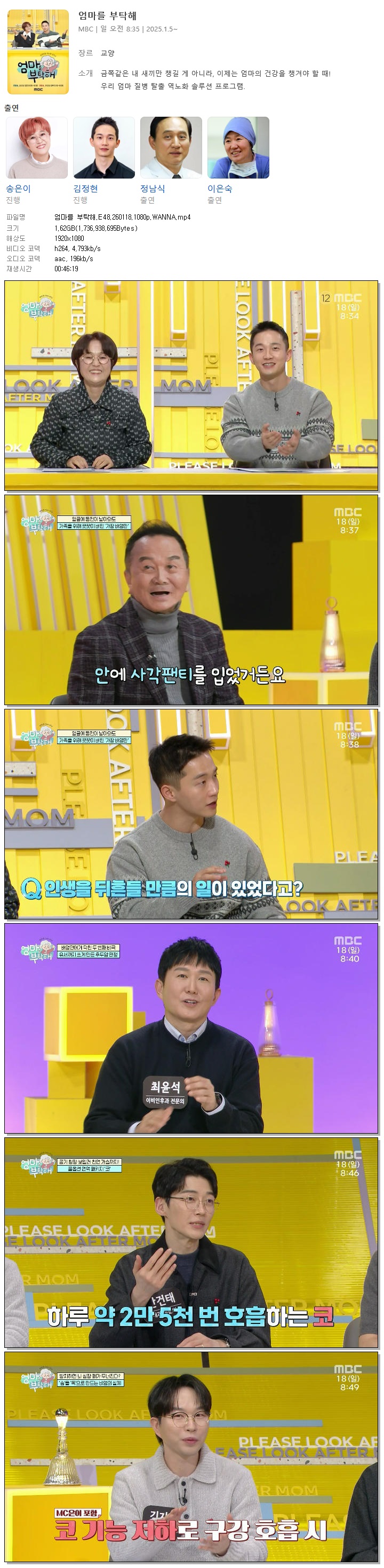 | [MBC] 엄마를 부탁해.E48.260118.1080p.WANNA[송은이, 김정현].mp4 | 1.6 G | 00:46:19 | 1920x1080 |