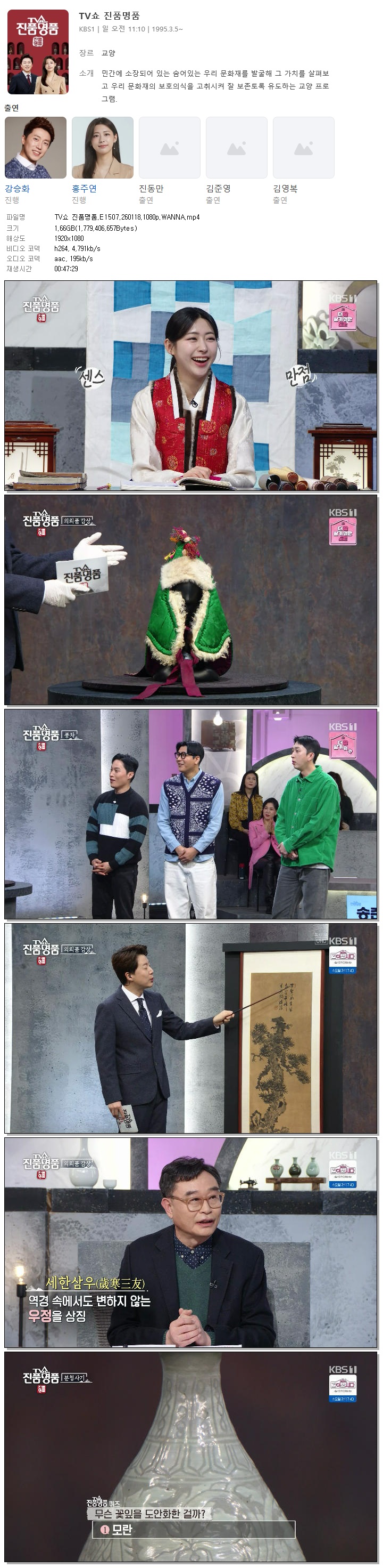 | [KBS1] TV쇼 진품명품.E1507.260118.1080p.WANNA[강승화, 진동만].mp4 | 1.7 G | 00:47:29 | 1920x1080 |