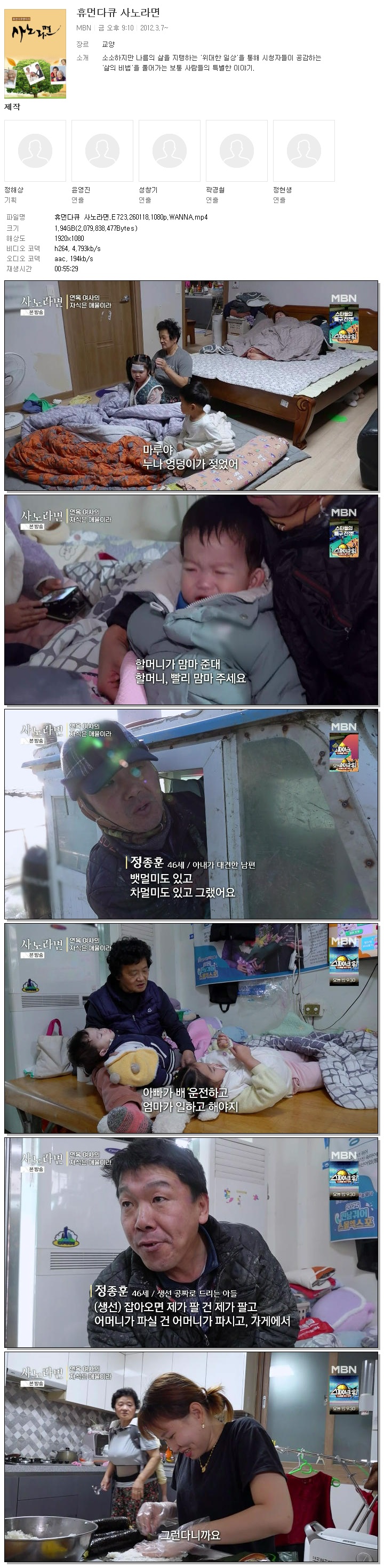 | [MBN] 휴먼다큐 사노라면.E723.260118.1080p.WANNA.mp4 | 1.9 G | 00:55:29 | 1920x1080 |