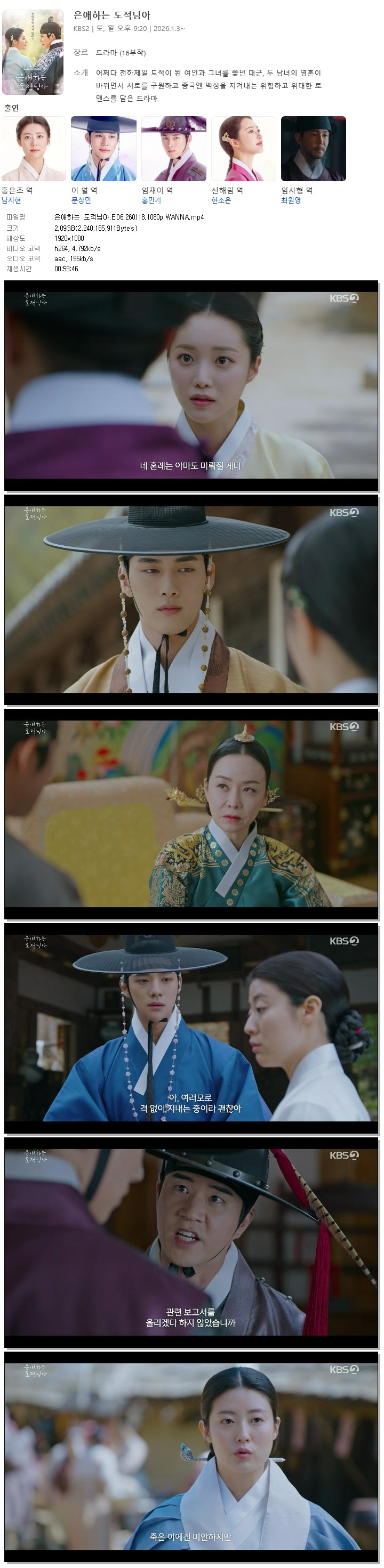 | [KBS2] 은애하는 도적님아.E06.260118.1080p.WANNA[남지현, 문상민].mp4 | 2.1 G | 00:59:46 | 1920x1080 |