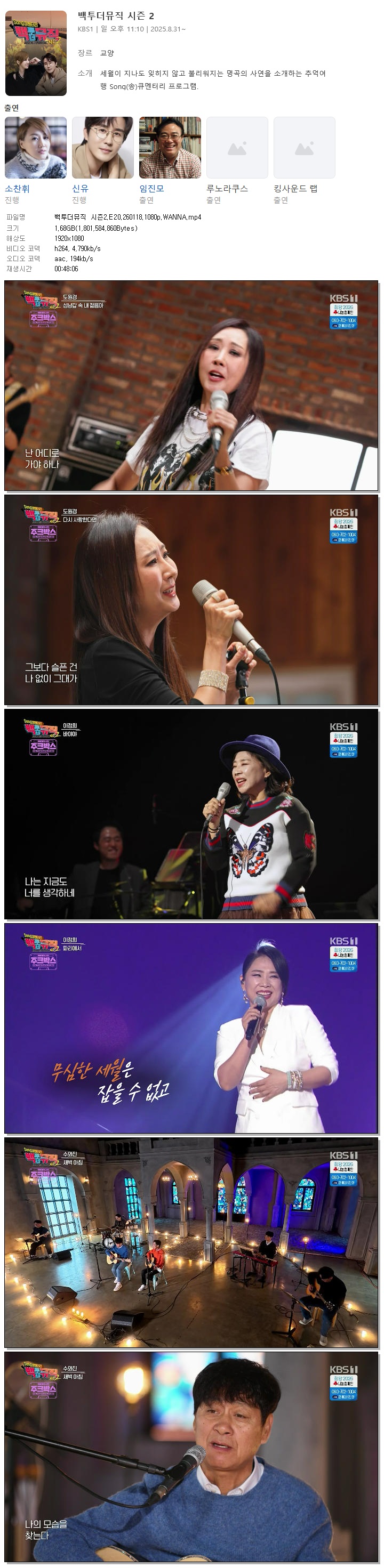 | [KBS1] 백투더뮤직 시즌2.E20.260118.1080p.WANNA[소찬휘, 신유].mp4 | 1.7 G | 00:48:06 | 1920x1080 |