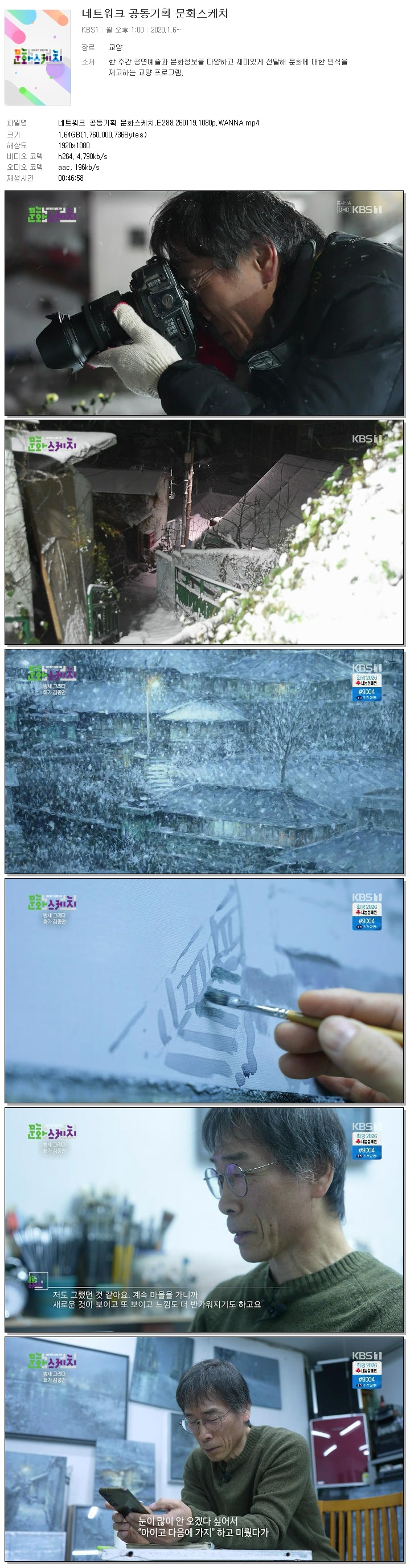 | [KBS1] 네트워크 공동기획 문화스케치.E288.260119.1080p.WANNA.mp4 | 1.6 G | 00:46:58 | 1920x1080 |